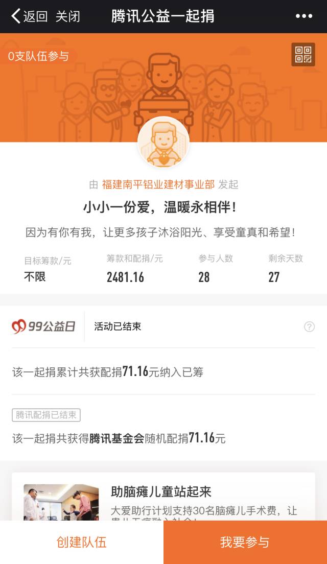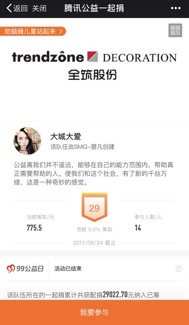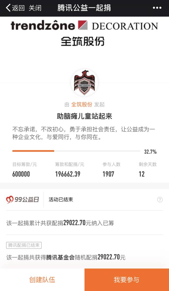 2017年9月7日-9月9日,備受矚目的年度國(guó)民公益盛事“99公益日”如約而至!全筑股份積極踐行企業(yè)社會(huì)責(zé)任,加入99公益日活動(dòng),為大愛助行項(xiàng)目,為腦癱兒童手機(jī)治療及康復(fù)費(fèi)用助力。